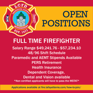 Applications may be obtained from our website at www.lafayettems.com or Lafayette County Chancery building and submitted to County Administrator’s Office, 300 North Lamar Blvd., Oxford, MS 38655 until 5:00 P.M., September 5th, 2025.